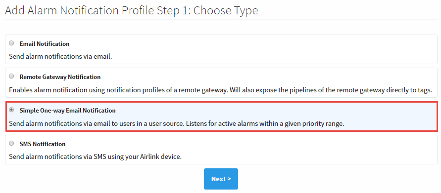 A list of all the alarm notification profile types will appear. Choose Simple One-way Email Notification, and click Next.