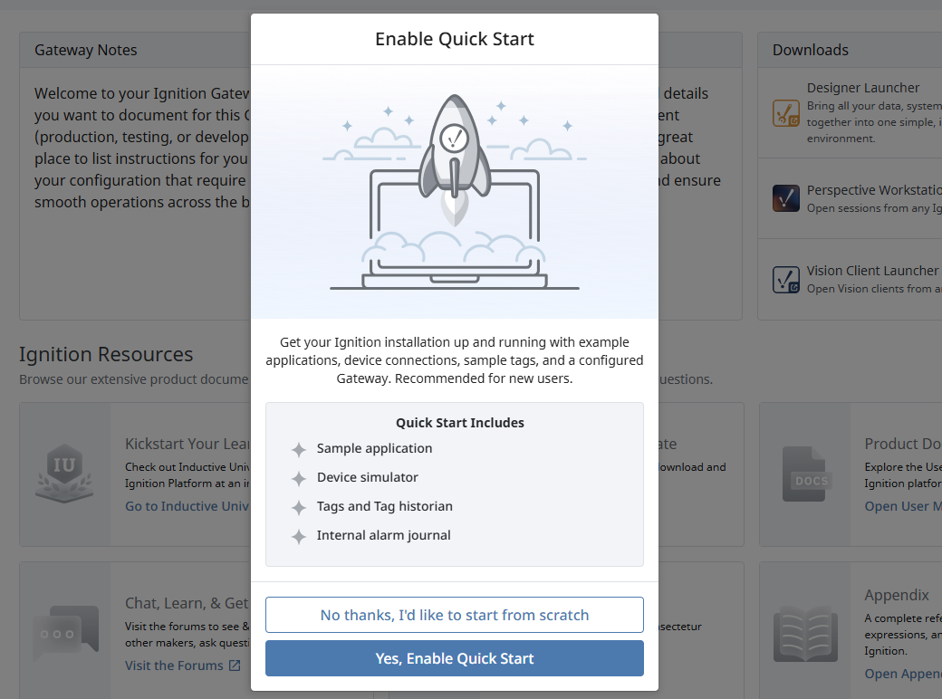 Once the installation process has finished, you'll be redirected to the Gateway Webpage. From there you'll be asked to opt into the Quick Start configuration, which makes several configuration changes to the system. Quick Start can only be enabled upon a new installation.