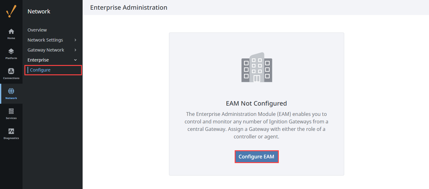 Navigate to Network > Enterprise > Configure and select Configure EAM. The EAM Setup Wizard will appear.