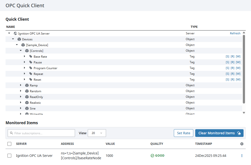 The page displays a tree view of the Ignition OPC UA Server, including connected devices and their exposed nodes. Expand the tree to browse available objects and tags. Nodes display action indicators that reflect their capabilities. [R] indicates read access, [W] indicates write access, and [S] indicates that the node can be subscribed to. Clicking [S] creates a subscription for the selected node and adds it to the Monitored Items table at the bottom of the page, where live values, quality, and timestamps are displayed.