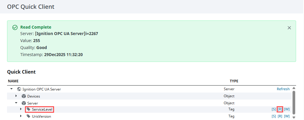 The OPC Quick Client can be used to verify which Gateway is currently active in a redundant Gateway pair by reading the OPC UA server's runtime status.
