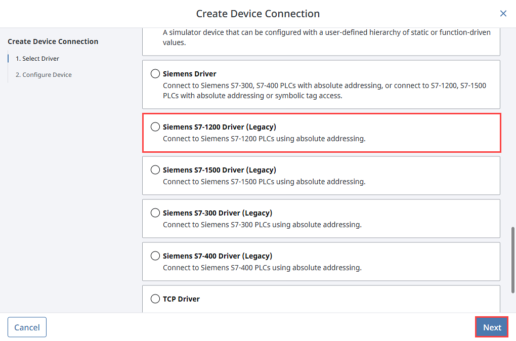All four of the available driver options are shown on the Select Driver form. For this example we will select Siemens S7-1200 Driver.