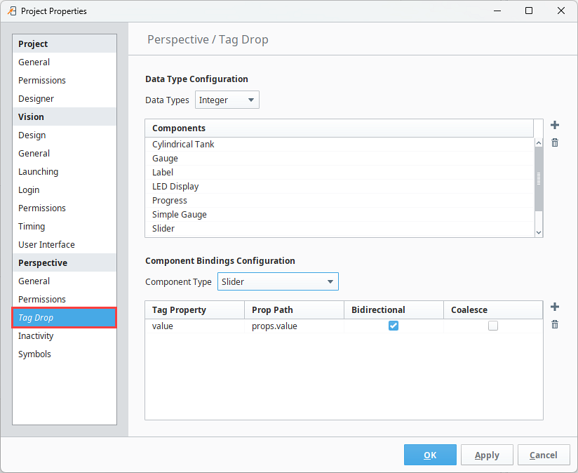 Tag Drop properties provide a way to link certain data types of tags to commonly used components when dragging-and-dropping a tag onto a view. This is done in Project Properties under Tag Drop in three steps: select the data type, select the component to create, and select the bindings that are created on that component.