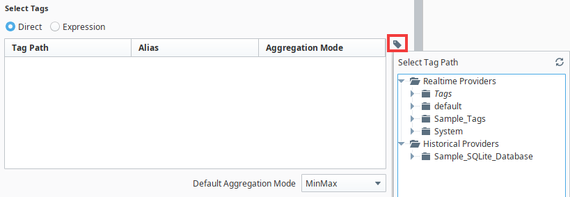 | Select Tags | An area to select the tags to trend. Tag paths can be defined directly or using an expression. See Using Dynamic Tag Paths below about Expression mode. Users may browse for and select tags from both Realtime and Historical Tag Providers. ![]() |