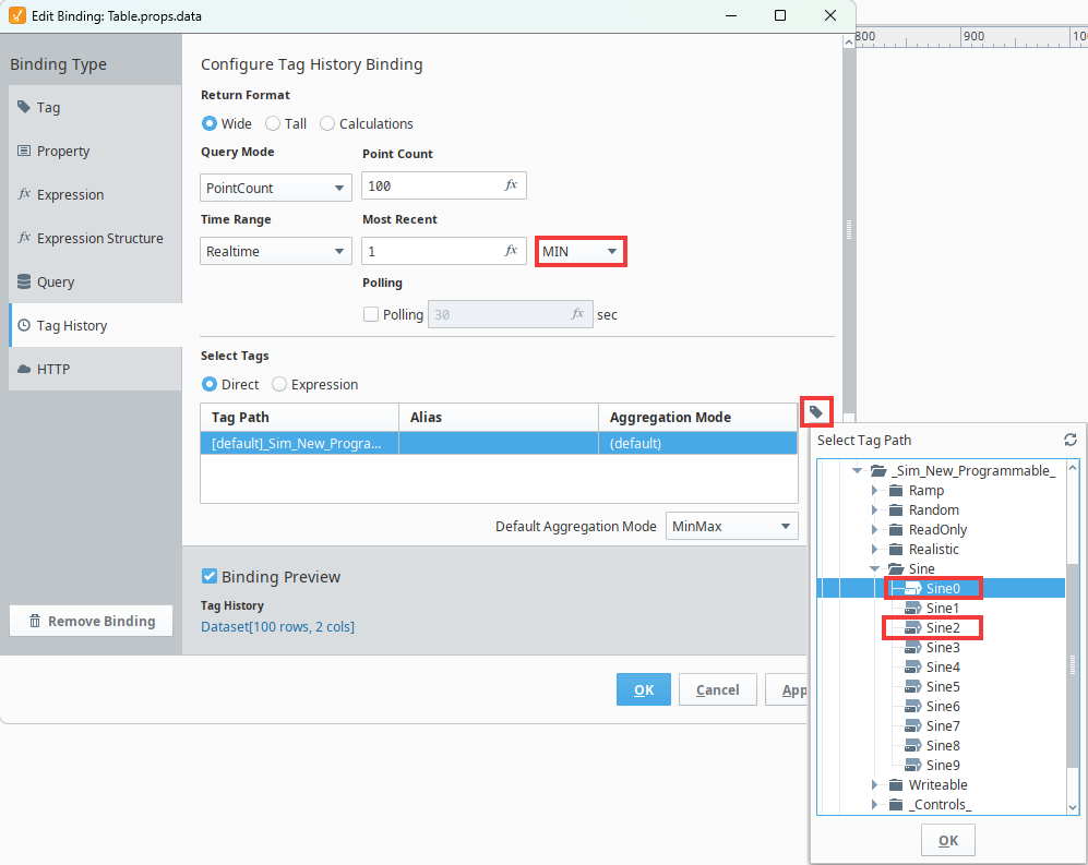 Notice the Binding Preview at the bottom of the screen. Click OK to save the Tag History binding.