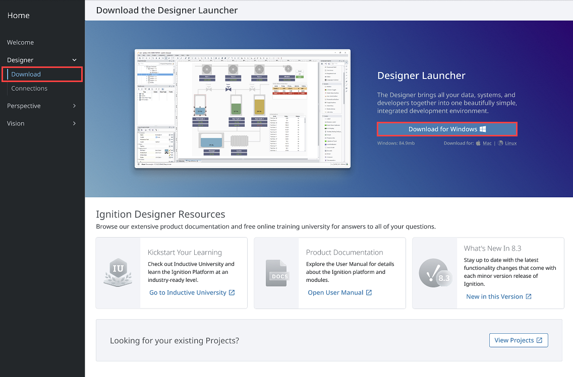 Ignition features several launchable runtimes: Vision Clients, the Designer, and Perspective Sessions. To help with managing these separate systems, Ignition Gateways provide several launcher programs for each runtime. These launchers are the main means of launching an Ignition runtime application. For the purposes of clarity, the following are considered launchers: