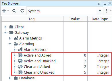 To view these tags, open the System Tag Provider in the Tag Browser of the Designer, and navigate to the Gateway > Alarming folder. These System Tags can easily be used to visualize all alarms in the system.