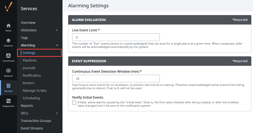 Notify Initial Events | Default is false. If false, active alarms caused by the "initial state" (that is, the first value checked after being created, or after the enabled state changes) won't be sent to the notification system. This means if you add an alarm to a tag, a notification won't be immediately sent when the new state is created. |