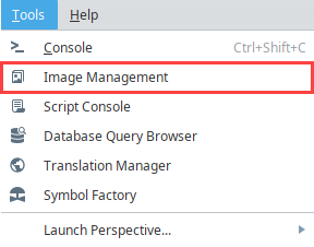 Images such as PNGs, JPGs, GIFs, and SVGs can be managed using the Image Management tool. These files are stored to the file system by the Gateway as image resources that include the image file and associated metadata. The Image Management tool is accessed from Tools > Image Management in the Designer, as shown below.