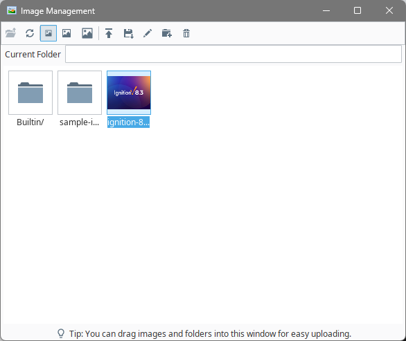 You can upload images by dragging one or more image files or folders from your local file system directly into the Image Management tool, or by using the Upload icon to select images from your local file system.