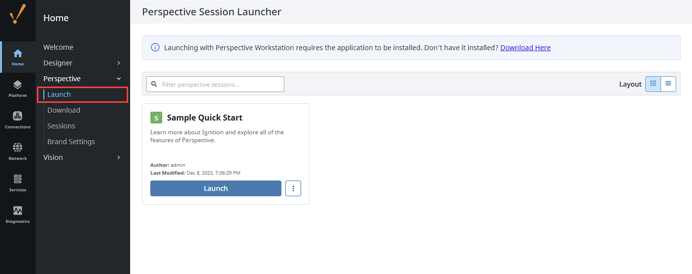 The Launch page will list all available Perspective projects with their description, author, and last modified date. Use the grid and list view icons on the upper right-hand side to switch the project layout. Project listings can additionally be filtered by included information as needed.