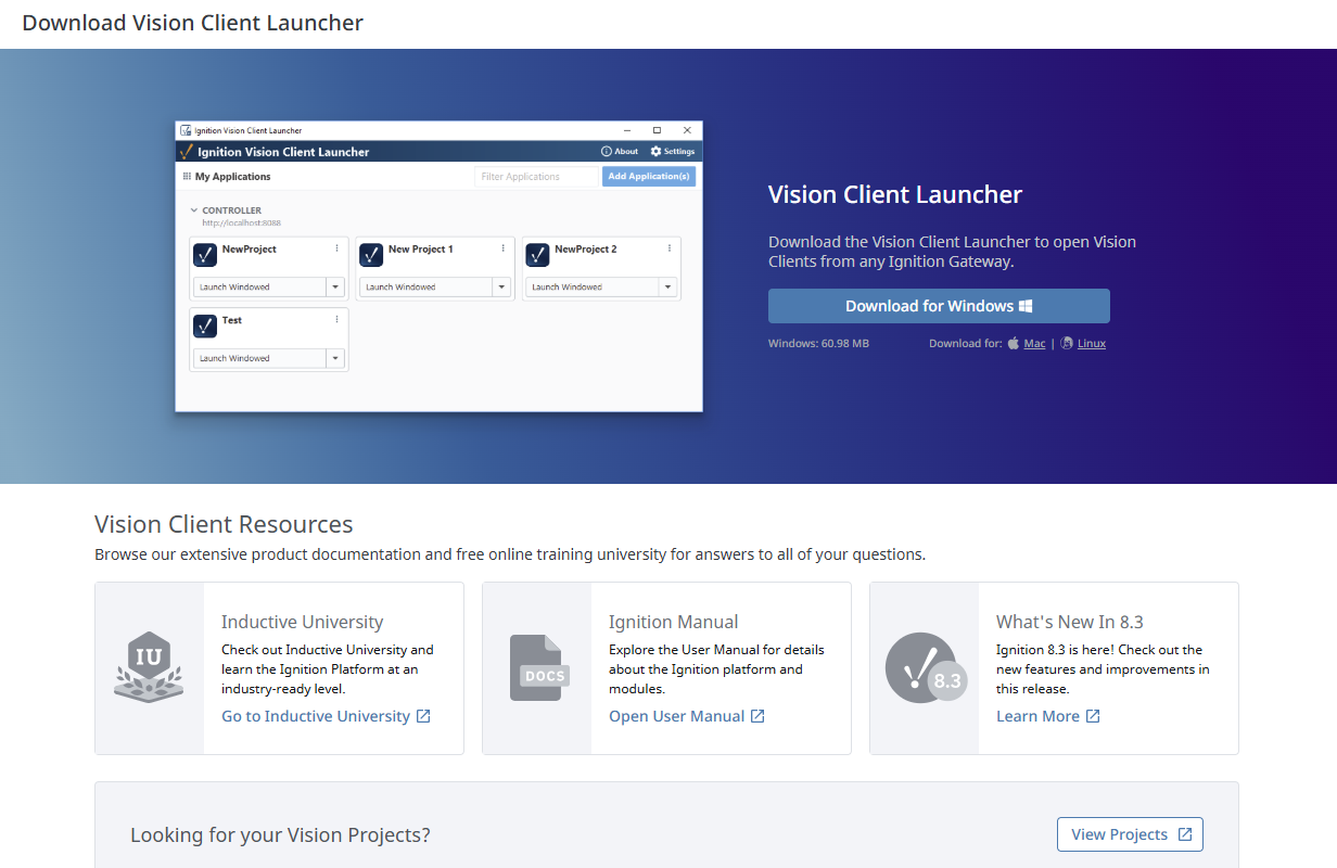 The Vision section of the Gateway includes Launch, Download, and Clients pages for easy access to basic project information and the ability to download the Vision Client Launcher. From here users can even directly launch a Vision Client.
