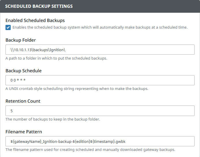 | Filename Pattern | The filename pattern used for creating scheduled and manually downloaded Gateway backups. The default pattern is ${gatewayName}_Ignition-backup-${edition}${timestamp}.gwbk. Supported placeholder values include: