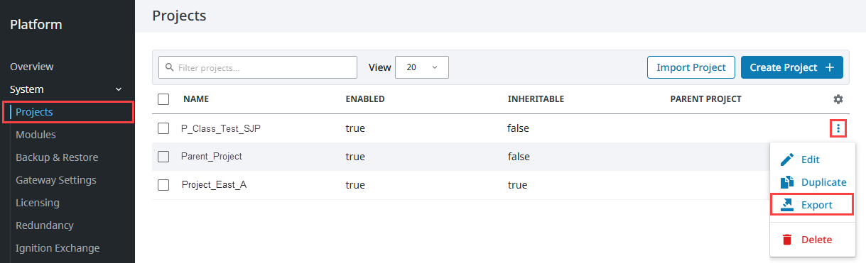 Project backup and restoring from a project backup is referred to as Project Export and Import. Projects are exported individually, and only include project-specific elements shown in the list below. They do not include Gateway level configurations, like database connections, Tag Providers, and tags. The exported file (.zip