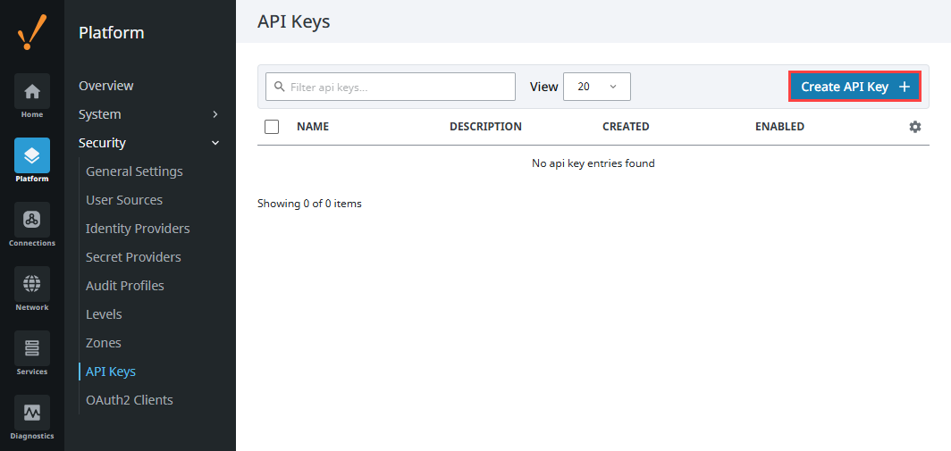 Access your Gateway and navigate to Platform > Security > API Keys.