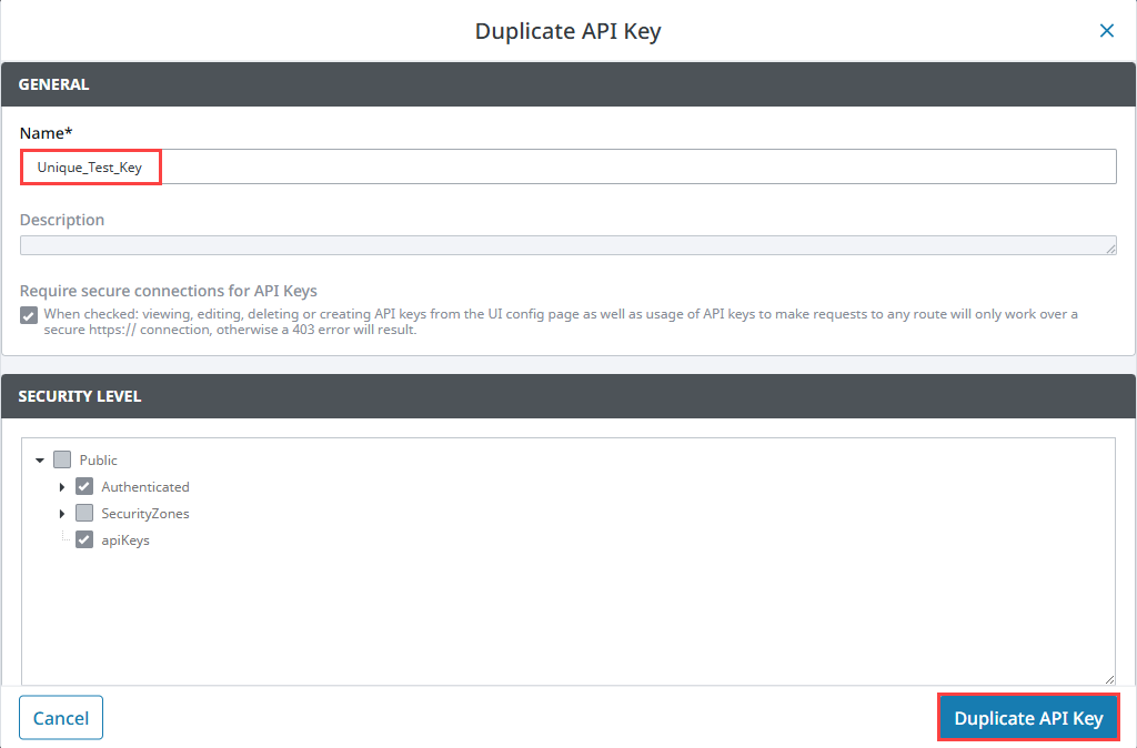 Enter a name for your API Key, and optional description. By default, Require secure connections for API Keys is enabled.