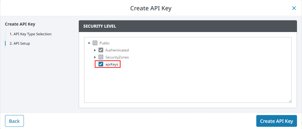 In this example, a new security level named apiKeys was created and selected.