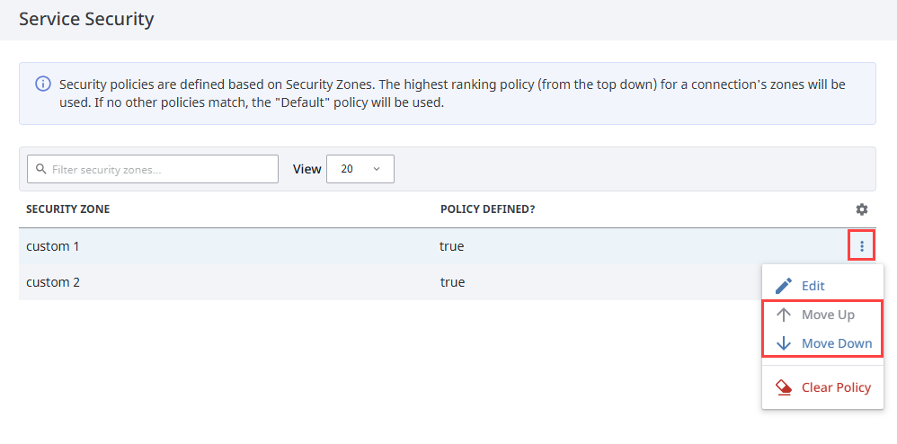 When Security Policies have been defined for two or more zones, new options appear on the Service Security page when the three dot menu is expanded to move the zones up and down the list. This allows a priority to be set on the Security Zones, since a connection can apply to multiple zones. Requests from a connection, first determine which Security Zones they belongs to by starting at the top of the Service Security list and working down until finding the first zone they are in. Then, they use the access rights of that zone.