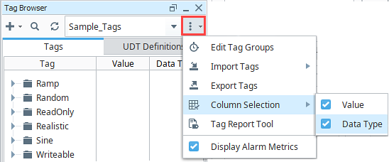 The Tag Browser displays the Value and Data Type. The Value type is set by default. To toggle any of the options, click on the Column Selection icon, then click the checkbox. In the example below, the Data Type is enabled.