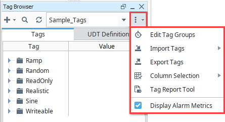The Tag Browser displays the Alarm Metrics values by default. To change the visibility of Alarm Metrics, toggle the Display Alarm Metrics checkbox as needed.