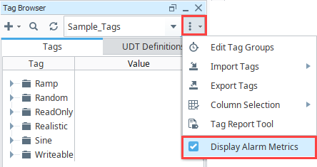 The Tag Browser More icon includes an option to show/hide the Alarm Metrics. They are displayed by default, so the Display Alarm Metrics option will need to be unchecked if you don't want them to be visible.