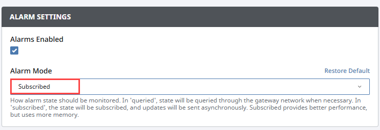 Remote tags are a very efficient service by default, but can be more useful if you adjust the Alarm Mode for systems split between Back-End and Front-End servers. Alarms should already be visible on the Back-End and are queried by default. Selecting Subscribed for the Alarm Mode pushes alarm notifications immediately on the Front-End server.