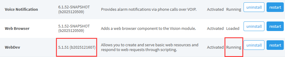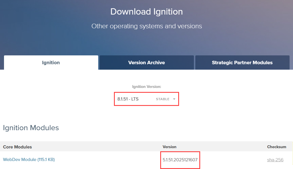 Because the WebDev module shown above has 3 as the middle digit and the Gateway has 1, there is a version mismatch and the module will remain in a faulted state. To resolve this, download the correct version of the module from the Inductive Automation Downloads page. Use the Ignition Version dropdown or Version Archive tab to select the Ignition version that matches your Gateway. From the list of available modules, locate the compatible version and download it.