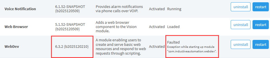 In some cases, a module may appear to install successfully, but its functionality does not become available. A common cause of this behavior is a version mismatch between the installed module and the Ignition platform. For a module to load correctly, the middle digit of the module version must match the middle digit of the Ignition platform version. If a version mismatch is detected, the module will display a State of Faulted: Exception while starting up module on the Module Configuration page.