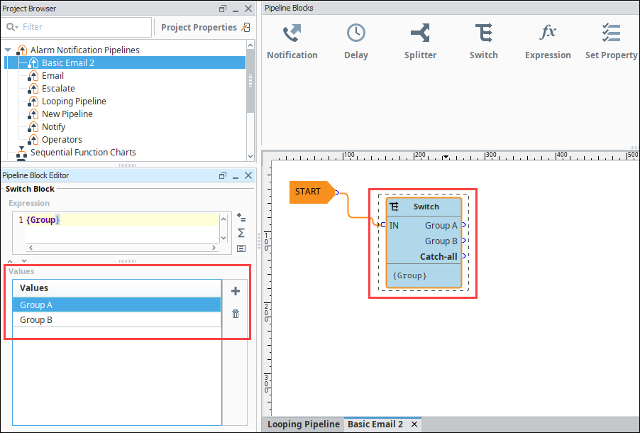 Drag a second Notification block to your pipeline, and connect Group B from the Switch block to the IN on the second Notification block.
