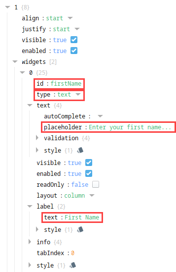Widgets live at deeper paths under props.columns.items[x].rows.items[x].widgets[x]. However, they function as their own complete layer of configuration where each widget represents a single form input like a text field, dropdown, toggle, or slider. All widgets share a common set of base properties, and each widget type introduces its own additional configuration options.