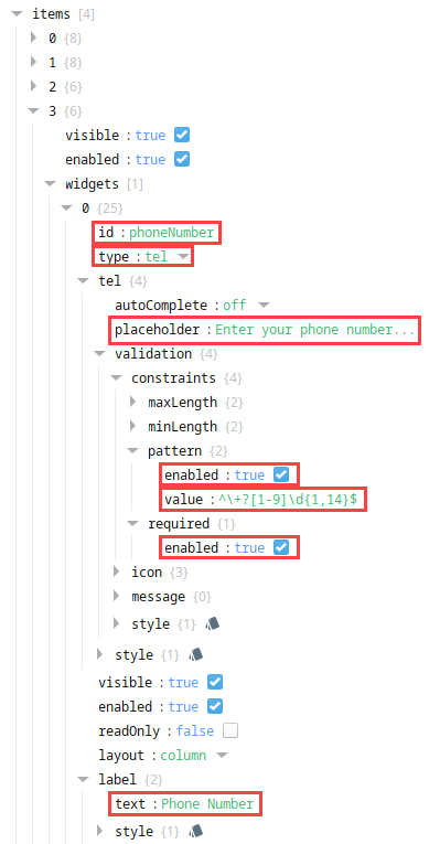 | props.columns.items[0].rows.items[3].widgets[0].tel.validation.constraints.pattern.value | ^\+?[1-9]\d{1,14}$ |