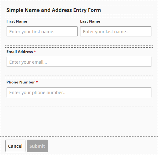 When a Form component is first added to a view, it will have a single column containing two rows for the header and input. This example demonstrates how to further configure multiple rows and validation for email and phone number fields.