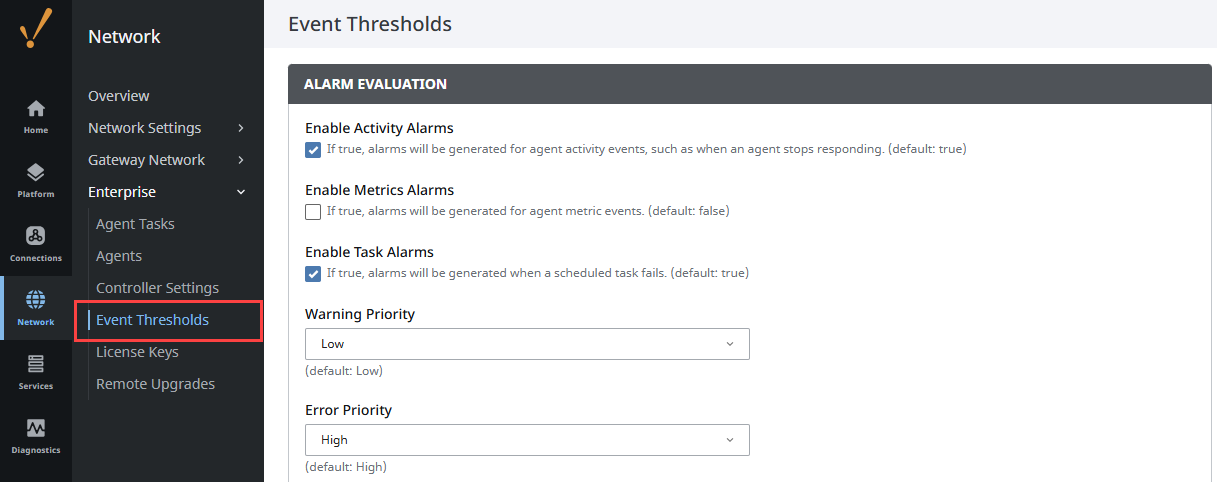 To view the event thresholds, go to the Network page on the Gateway and select Enterprise > Event Thresholds.