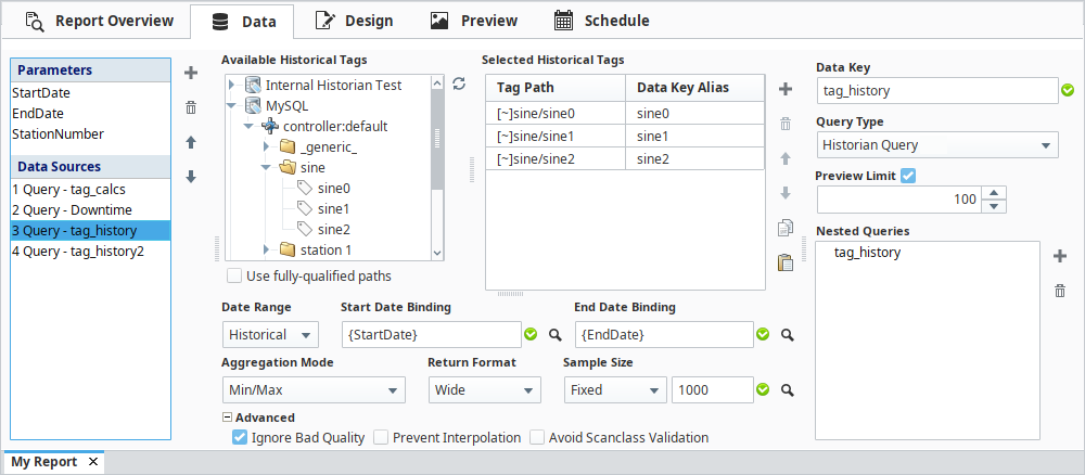 The Historian Query provides a simple way to query data from the Core Historian. In the Historian Query you can read data from Historical tags for specific date ranges, apply aggregates, and specify the sample size. It functions the same as a Tag History Binding and uses the same interface, so check out that page for more information on the individual properties.