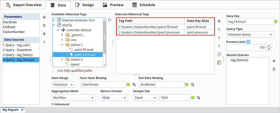 Additionally, a Historian Query can accept more than one parameter in a tag path. For instance, if each station had different areas for paint pressure and paint fill level tags, you could reference the station area using the parameter Area.