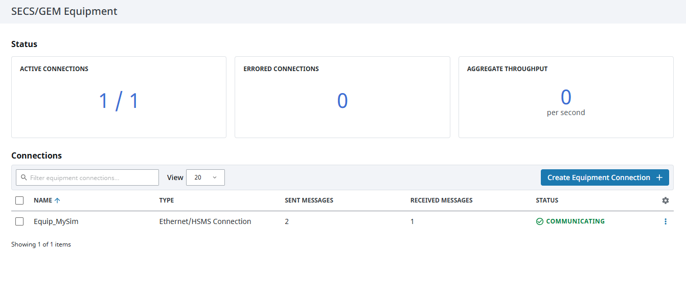 The SECS/GEM Equipment page displays all configured equipment connections, their current status, and message activity.