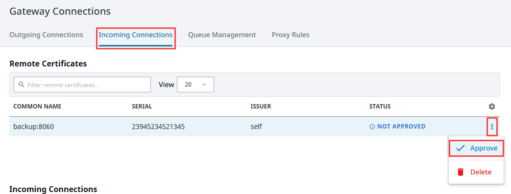 Now the Gateway’s connection will appear under the Incoming Connections section with a PendingApproval security status. Expand the three dots menu and select Approve to establish the connection.