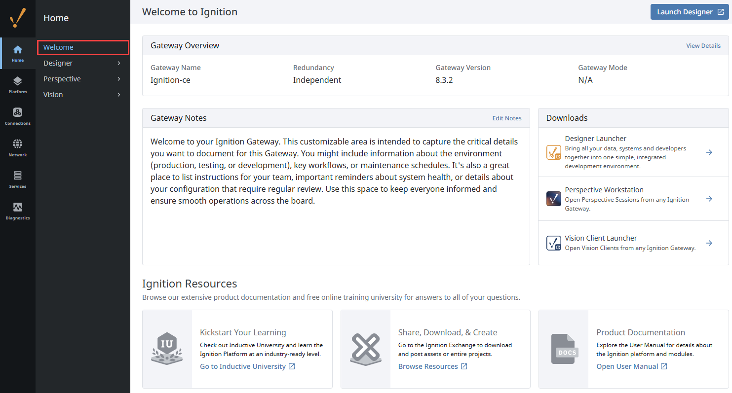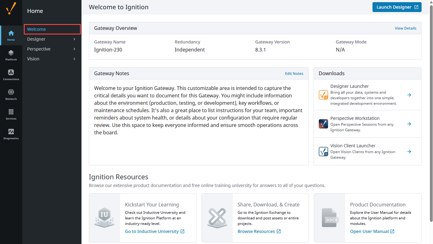 The Welcome page displays Gateway Overview information and any configured notes for users to stay informed. As a logged in user, you'll see the Gateway Overview stats displayed at the top of the page. Other sections on the page include Downloads, Gateway Notes, and Ignition Resources. The Downloads section briefly describes and links to the respective Download page under the Designer, Perspective, and Vision sections. Upon initial installation, the Gateway Notes section will include default text with suggestions for how to utilize the field. Select the Edit Notes link to update the displayed Gateway Notes text.