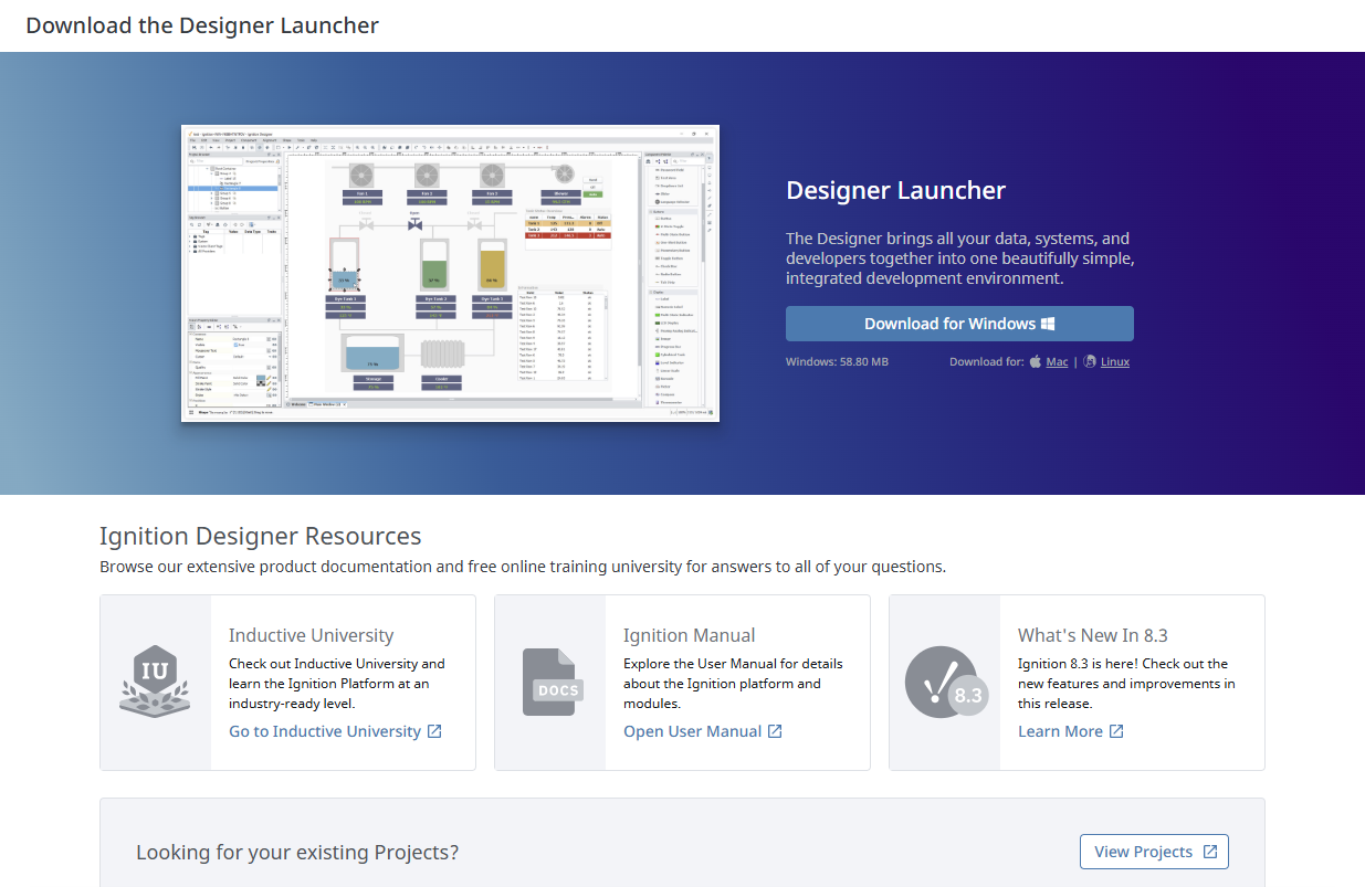 Aside from download options, this page also includes links to additional resources like Inductive University. Selecting the View Projects link at the bottom of the page will navigate to the Gateway Platform > System > Projects page.