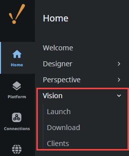 The Vision section of the Gateway includes Launch, Download, and Clients pages for easy access to basic project information and the ability to download the Vision Client Launcher. From here users can even directly launch a Vision Client.