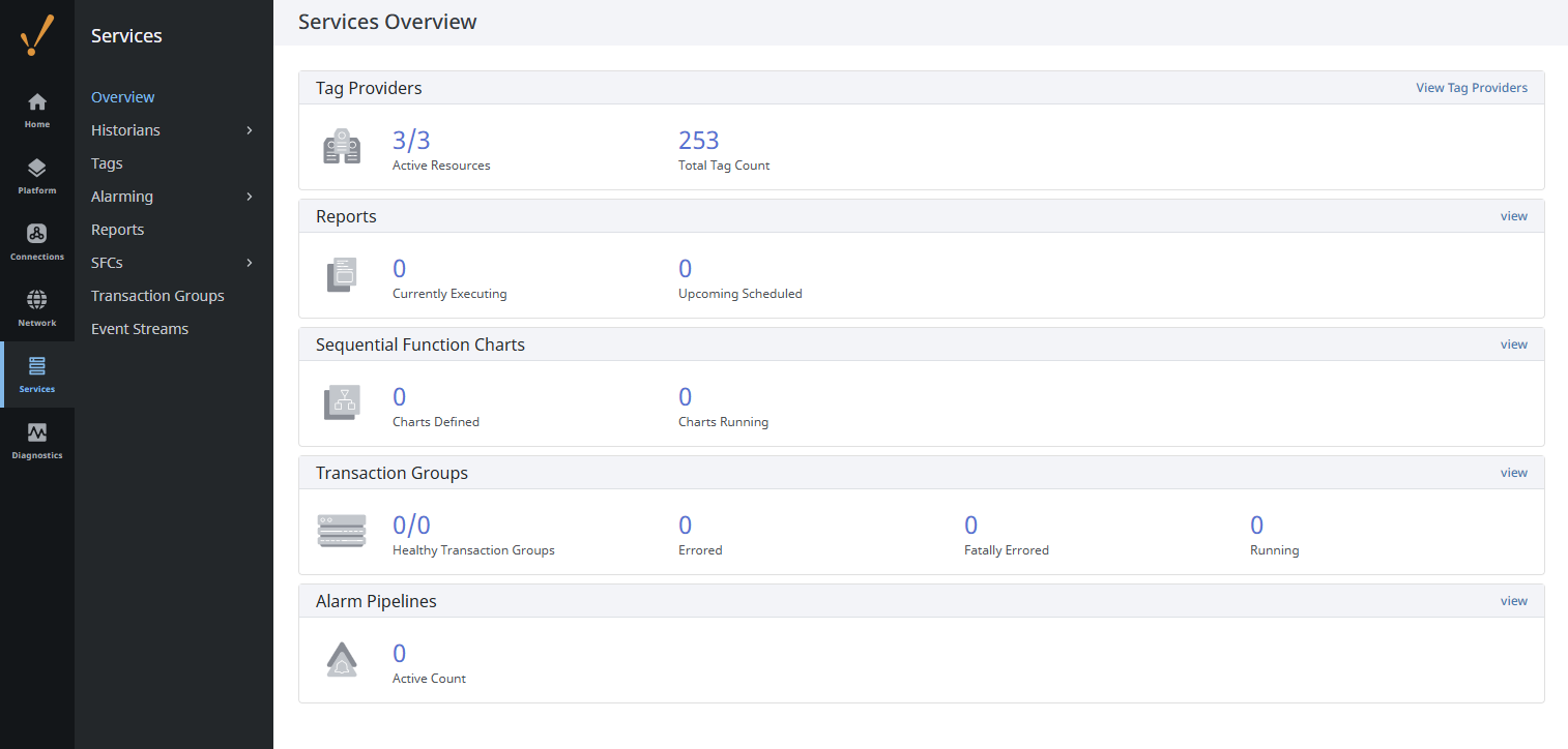 The Services Overview page displays a status summary for all the configured connections, including the number of services currently configured, errored, or running. The sections listed below are split by service types to show the individual status counts. Clicking on the View link on the far right will navigate to the corresponding Gateway page.