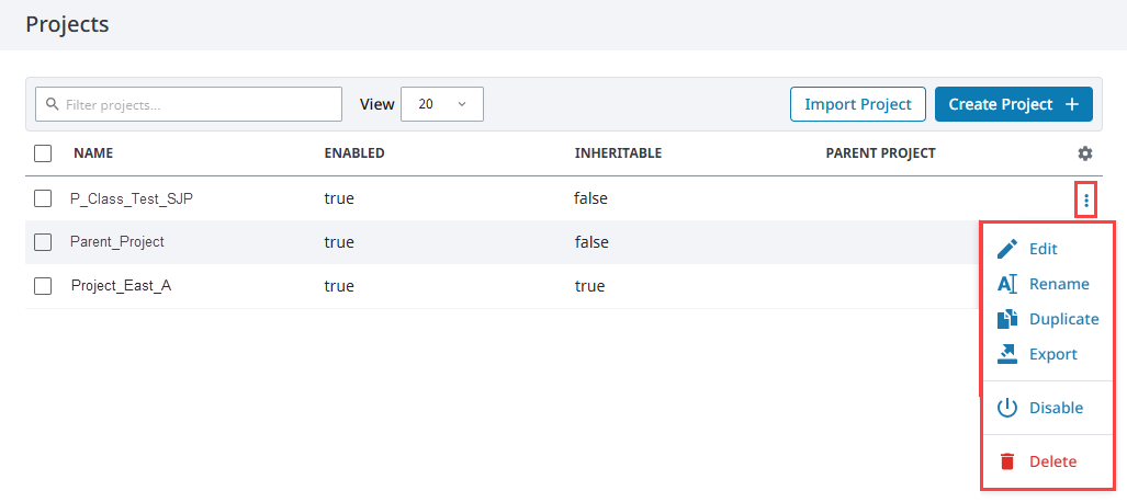 Once you have a project or two (or twenty) set up, you might want to change some of the base settings. You can manage the projects from the Platform section of the Gateway by going to System > Projects. The Projects page displays all your projects. To the right of the project name, click the three dot menu. Once expanded, you'll see all the actions you can take for your project, such as Edit, Rename, Duplicate, Export, Disable, and Delete.