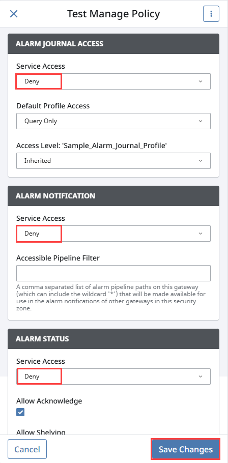 Service Security defines the security policies established at the source for what data is accessible. It can define if a specific service is available at all, read-only, read-write, and so forth regardless of connection direction. Zero-trust is not the default security policy, but it should be highly considered since being strict about security is the best way to control the flow of data. A zero-trust policy will reject all unwanted requests. To update your Default policy to zero-trust, navigate to Platform > Security > Zones and click on Manage Policy within the three dots menu for your security zone. Use the Service Access dropdown on each Alarm section to select Deny, then click Save Changes when finished.